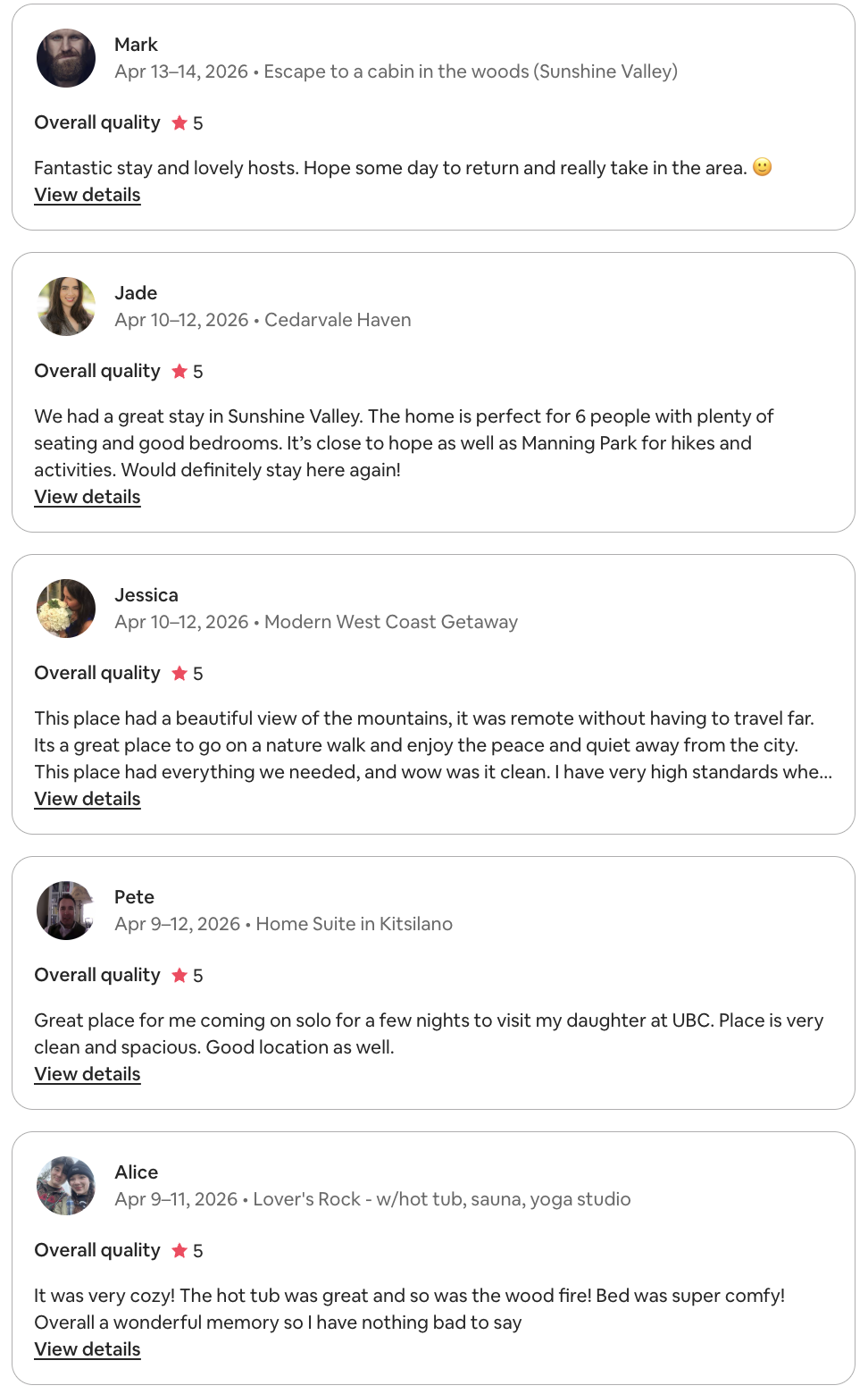 We specialize in recreational properties (cabins) and rental suites in the city. We service the Fraser Valley and Metro Vancouver areas. Specifically these areas: